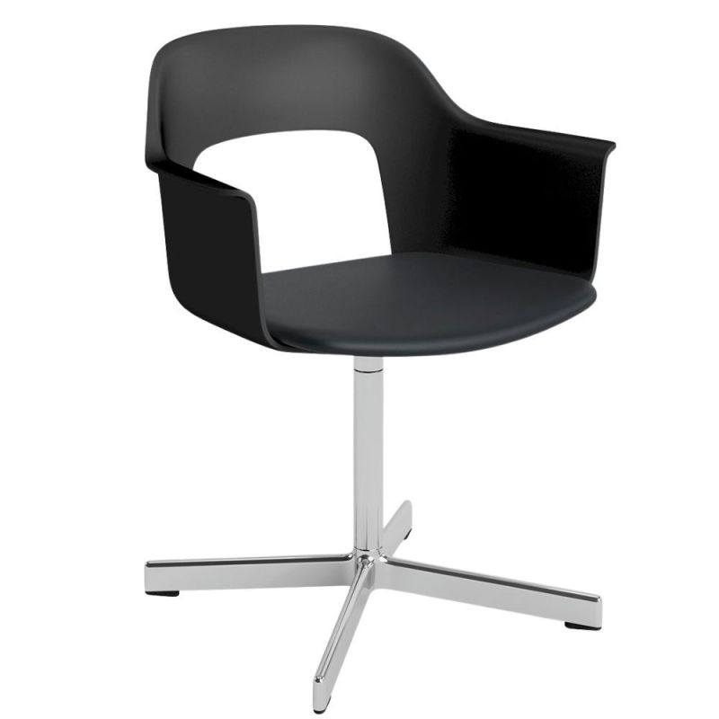 Layout Armchair 233 Designed by Julien Renault with a focus on comfort, functionality, and sustainability. Upholstered seat, distinctive backrest opening, and swivel base with four legs for stability and mobility. Shell made from min. 96% recycled plastic in various colours. Base in polished or powder-coated aluminium. Seat available in textiles or olive leaf-tanned leather. All parts are detachable for longevity.