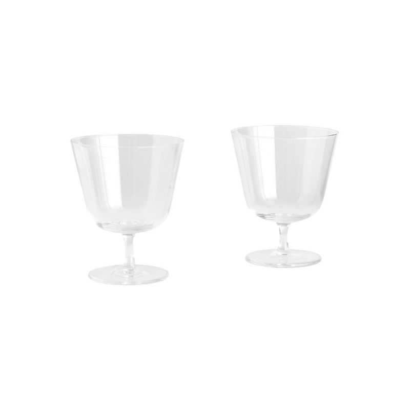 Curve Stem Glass Set of 2. The Curve Stem Glass has an elegant silhouette with a slightly flared rim for a simple and sophisticated look. The glasses are mouth-blown in delicate glass with 20% recycled material and feature both a spacious bowl and slim stem ideal for water, wine or other drinks. Sold as a set of two, they match beautifully with HAY's other tableware. Perfect for both everyday use and special occasions.