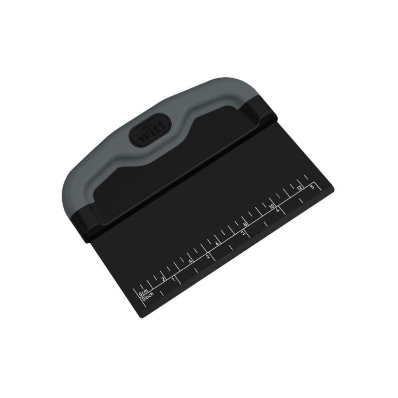 The Witt Pizza Dough Scraper - Black is made of durable stainless steel for long life. The sharp edge ensures easy cutting and lifting of dough, while the ergonomic handle provides comfort. Perfect for both pizza and bread preparation, an indispensable kitchen tool.