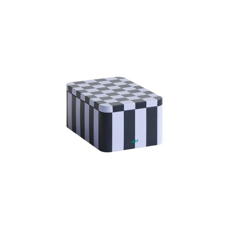Tin Containers colorful storage with graphic patterns. HAY's Tin Containers are decorative and functional storage boxes with colorful graphic designs. Perfect for dry goods or as stylish storage in the home. Available in many sizes, shapes and patterns.