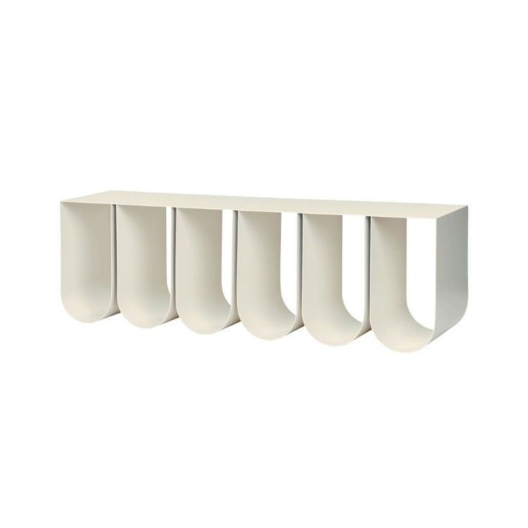 The 'Curved Wall Shelf' is designed with six discreet curves, making it ideal for storing in the hallway or displaying books and sculptures. The shelf is made of thin powder-coated steel with six curved storage frames, where the 'Curved Box' fits elegantly. It is part of the Curved series.