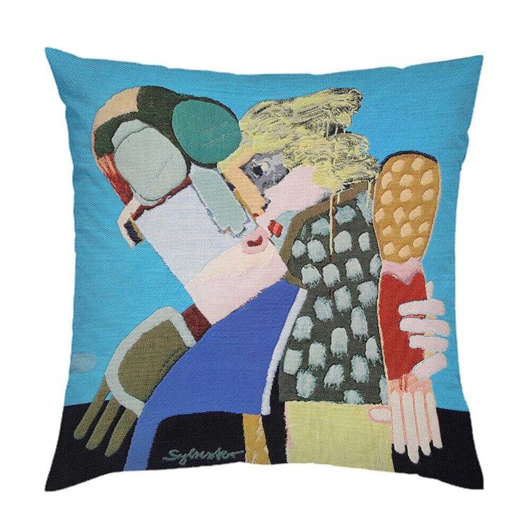 Poulin Design cushion with woven motif of Leif Sylvester's artwork "Kiss me", illustrating two people kissing each other. The art cushion is woven at the renowned French weaving mill, Jules Pansu, which has been designing exclusive textiles since the mid-19th century.