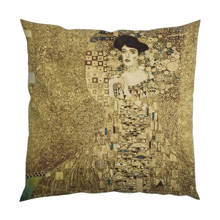 Poulin Design cushion with woven motif of Gustav Klimt's Portrait of Adele Bloch-Bauer I, also known as the Woman in Gold. The genesis of this beautiful portrait dates back to 1903 when sugar manufacturer, Ferdinand Bloch-Bauer, commissioned Gustav Klimt to paint a portrait of his wife, Adele.