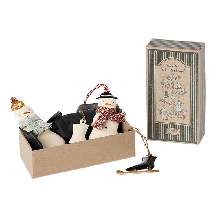 This elegant gift box contains 4 beautiful Maileg ornaments: a snowman, his wife and 2 ice skates. Each ornament is carefully wrapped in tissue paper and presented in a box adorned with Dorthe Mailil's artwork