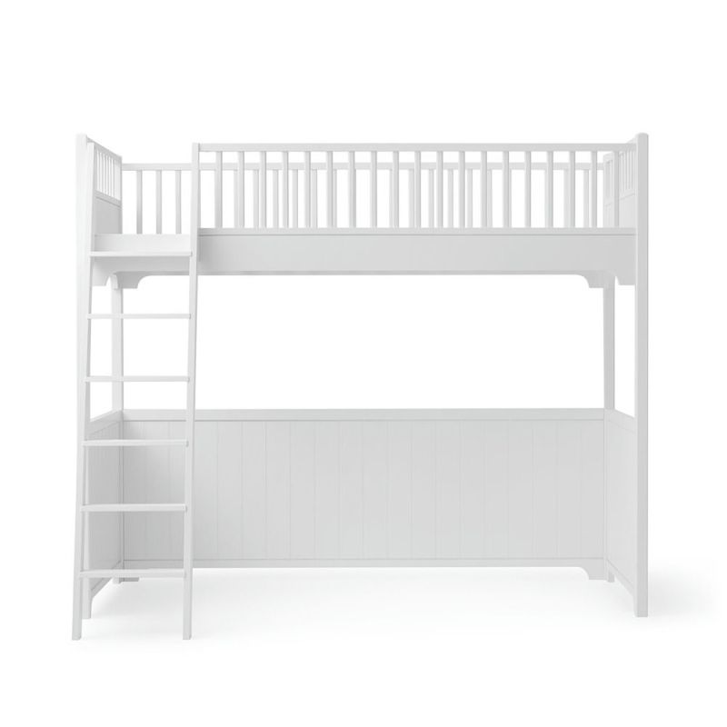 A high bed allows you to create an extra small, personal space in the children's room. Under the high bed there is room for a creative corner with a table and chair or a pillow corner where the child can immerse themselves in a book. The possibilities are endless and the child's imagination is free to unfold. At the bottom, the high bed is covered with a vertical profiled wooden panel that provides a beautiful and classic Scandinavian framing of the child's personal space. The steps on the ladder are wide so the child can get up and down easily and safely. The ladder can optionally be placed on either the left or right side.