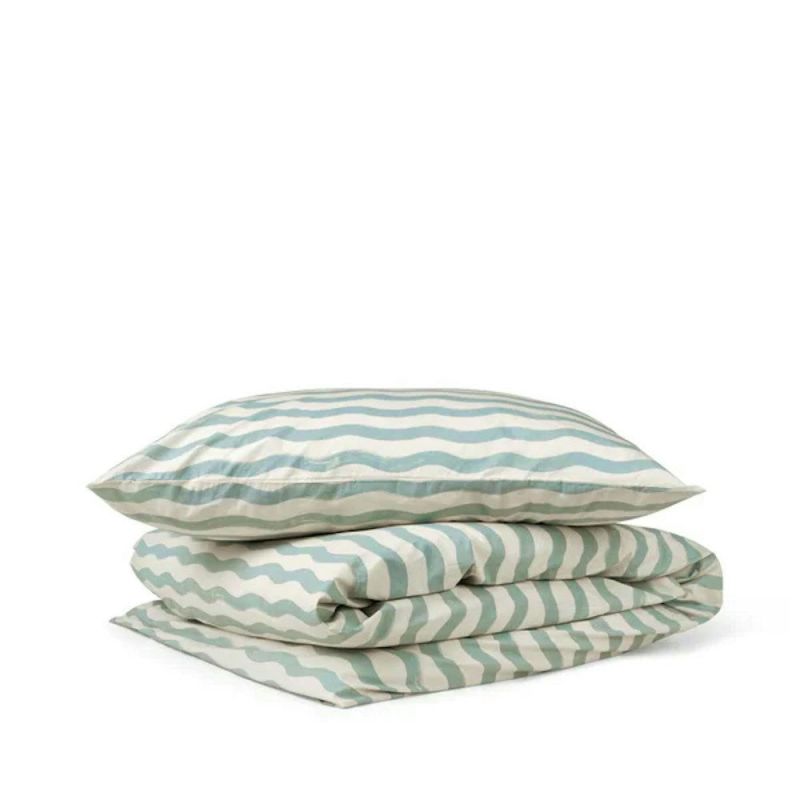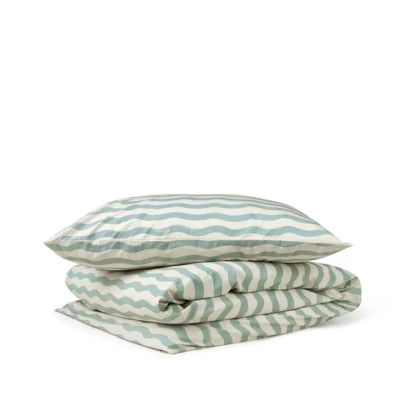 Soft bed linen in 100% organic cotton percale. The dense percale weave is not only durable and beautiful to look at, but also lightweight and breathable. The bedding is pre-washed, which gives a naturally curly look and makes the bedding incredibly soft against the skin and it only gets softer the more it is used. The pillowcase has an envelope closure, while the duvet cover closes with fine ties.