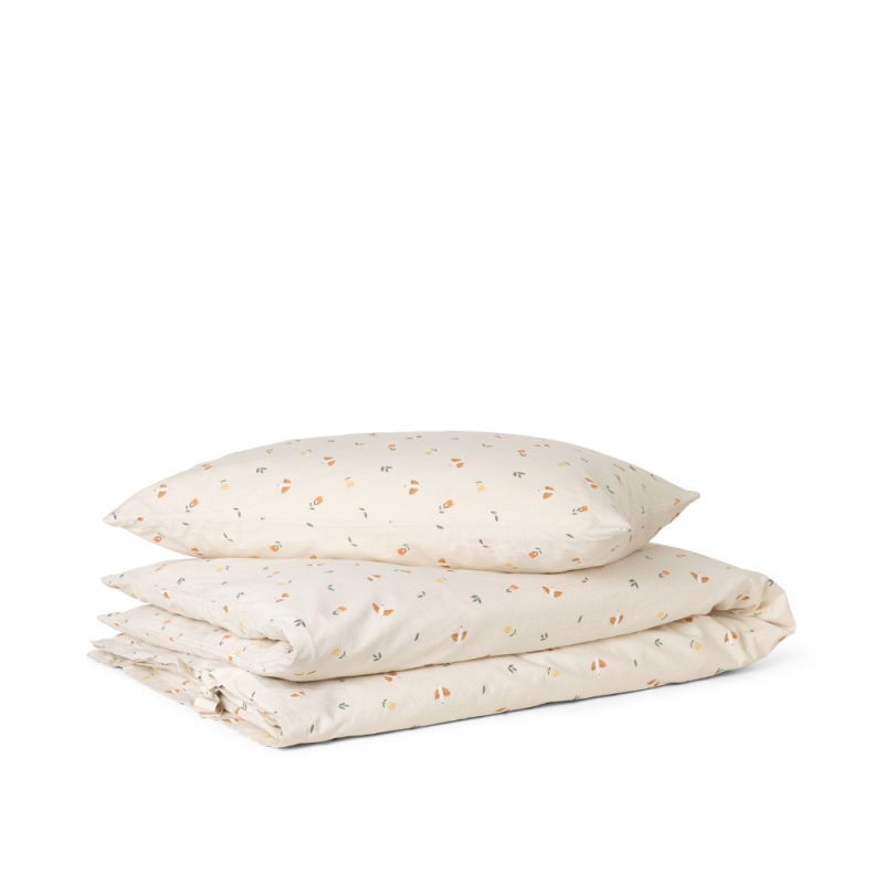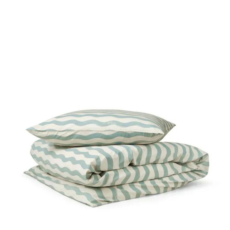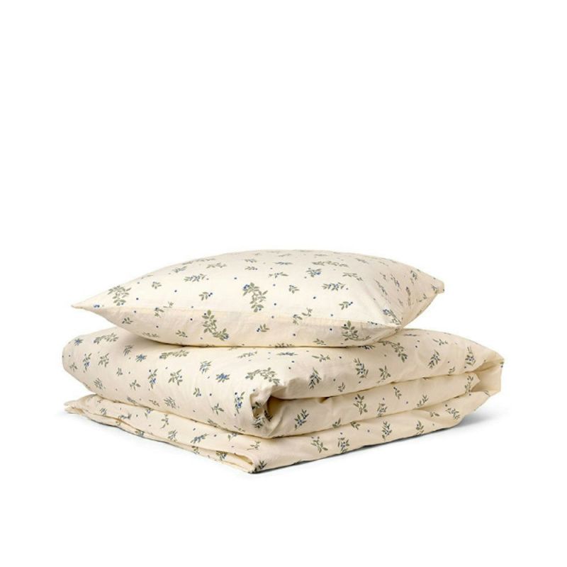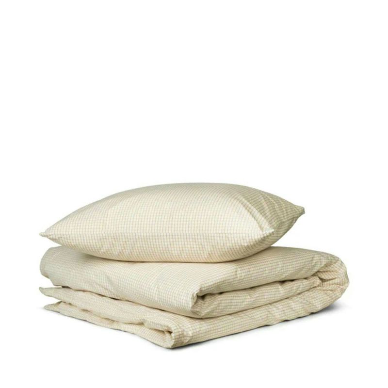 Soft bed linen in 100% organic cotton percale. The dense percale weave is not only durable and beautiful to look at, but also lightweight and breathable. The bedding is pre-washed, which gives a naturally curly look and makes the bedding incredibly soft against the skin and it only gets softer the more it is used. The pillowcase has an envelope closure, while the duvet cover closes with fine ties.