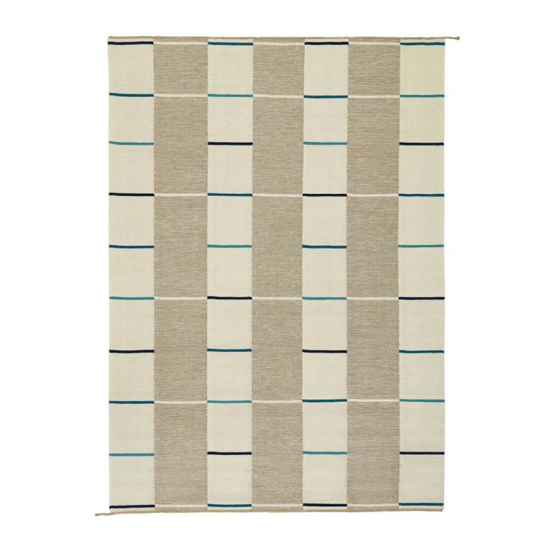 VK-11 was Vibeke Klint's last rug for a Copenhagen law firm in 2006. As always, she was inspired by the room where the rug almost covered the entire meeting room. The blue details matched the wall color. Handwoven in New Zealand wool with linen warp for durability and luxury.