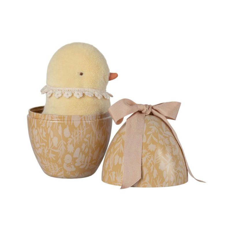 A cute soft plush chick with a vintage style cotton collar, comes in the prettiest metal egg with a beautiful print and a big bow on top.