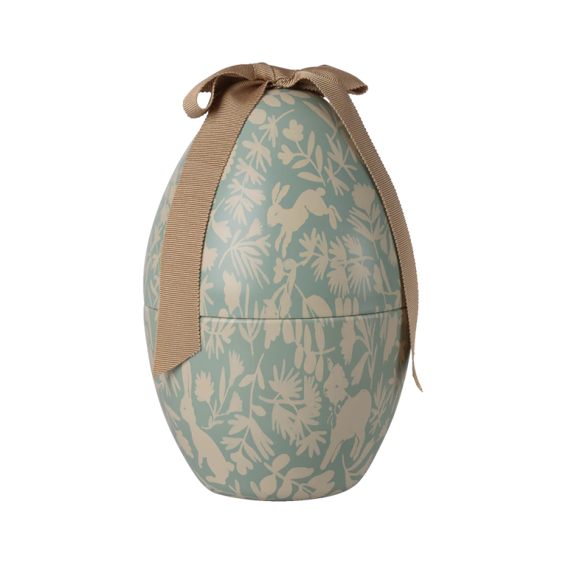 Metal Easter egg with a beautiful print. Take an extra look at the print and see if you can spot the different animals. The egg comes with a large soft bow on top, giving the egg an exclusive look.