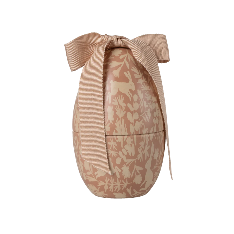 Metal Easter egg with a beautiful print. Take a closer look at the print and see if you can spot the different animals. The egg comes with a large soft bow on top, giving it an exclusive look.