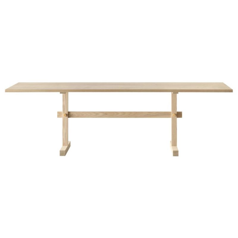 Gaspard 240 Dining Table. The Gaspard 240 combines classic form with modern simplicity. Crafted in solid oak with brass details that emphasize the table's clean lines and high quality craftsmanship. A solid and stylish choice for dining rooms, restaurants and offices.