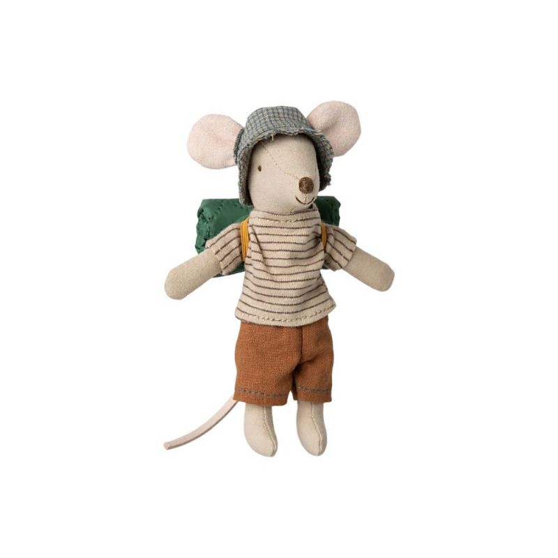 This mouse is well prepared for a hike in the wilderness. She is dressed for days of hiking and has brought her sleeping bag for nights under the stars. She has magnets in her hands. Add more accessories from the wandering mouse collection for more play.
