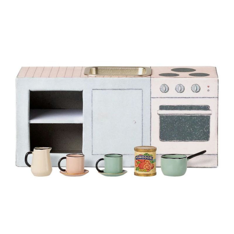 The little kitchen table comes with 2 cups, 2 plates, a pot, a jug, and a tin. The sink is metal for a realistic look. Perfectly fits the kitchen in the Suitcase mouse house.