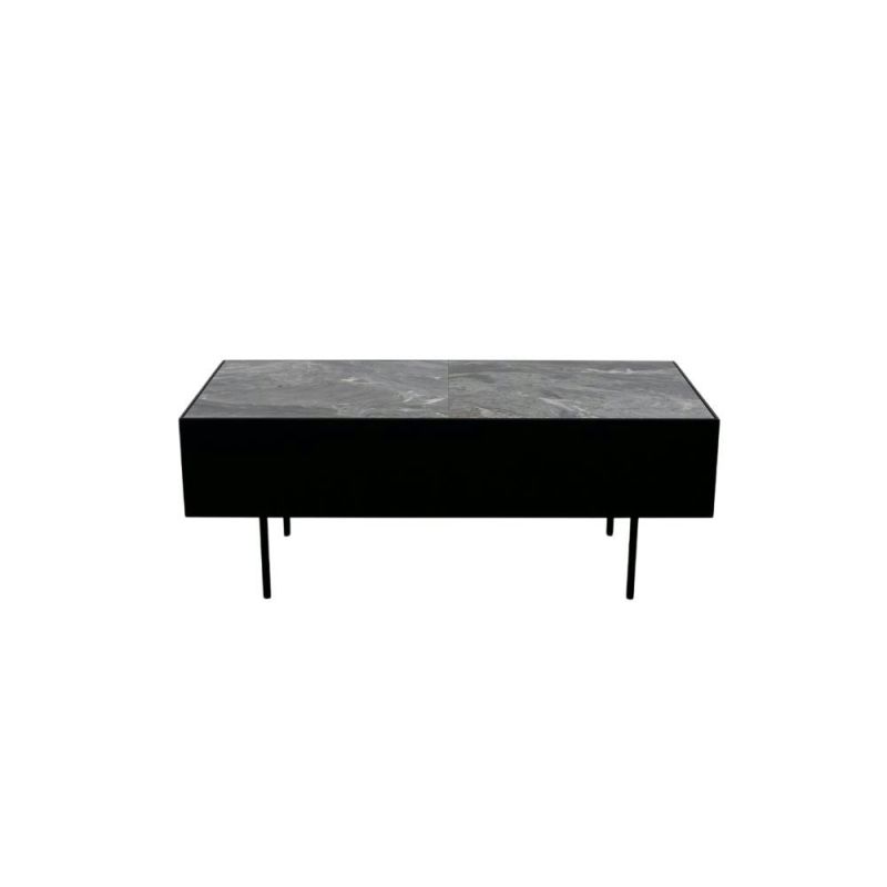 A coffee table where materials and design come together. The black wooden frame is combined with slim steel legs and completed by a distinctive marble top. Each marble top is unique with natural variations in grain and color play, giving your table an exclusive and personal touch like no other.