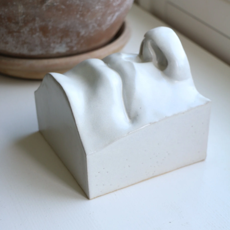 Bookend Mouth Antique White. Handmade in Aarhus with inspiration from ancient sculpture. Bookend Mouth combines function and form in a sculptural bookend that can just as easily stand alone as a decorative object. Place it on your bookshelf, desk, windowsill or hang it on the wall.