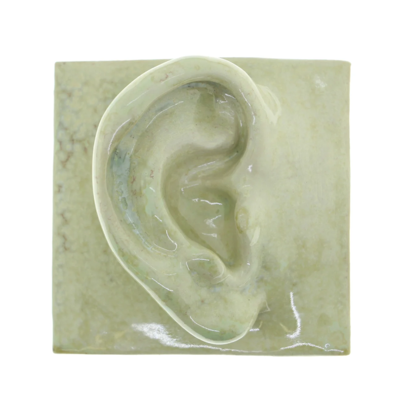 Right Ear Crystal Green. Relief of a right ear, handmade in Aarhus and inspired by ancient sculpture. Suitable for wall hanging alone or in interaction with other reliefs. Can be mounted in four different ways, giving you the freedom to create a personal expression.