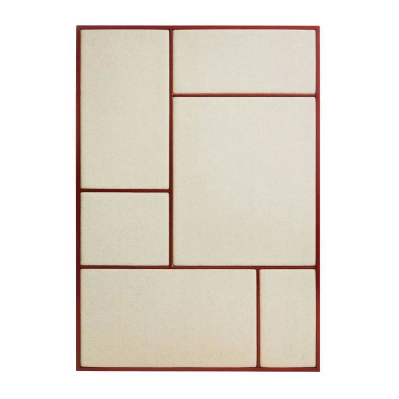 NOUVEAU PIN Notice Board Large, Basque Red. NOUVEAU PIN is a stylish and versatile notice board, ideal for everything from photos and concert tickets to mood boards and notes. The design is inspired by modern architecture and the Art Nouveau style, with a rectangular grid pattern and a precise edge profile. The board is available in three sizes, all with a common scale on one side, making it easy to combine multiple boards in a personalized pattern perfect for both home and office. It has a discreet all-round gripper edge and comes with hidden mounting brackets. The board also has a sound-absorbing effect that contributes to a calm atmosphere.