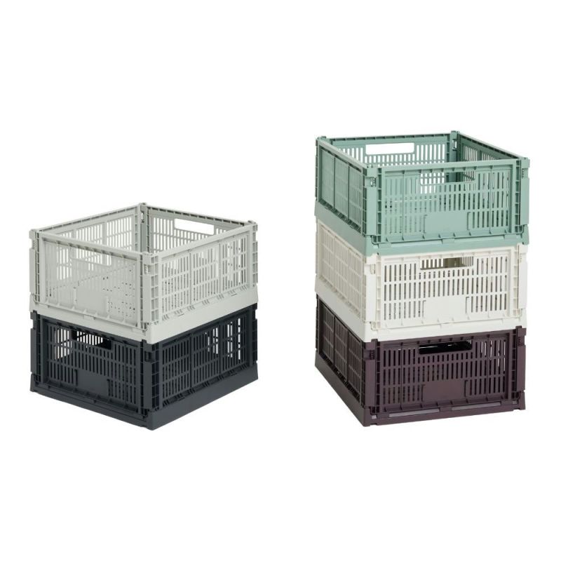 HAY Colour Crates. Practical and versatile storage box in 100% recycled plastic. The stackable crates are available in multiple sizes and colors with perforated design. Can be complemented with lids and wheels, folded flat and used for storage, display or creative decor.
