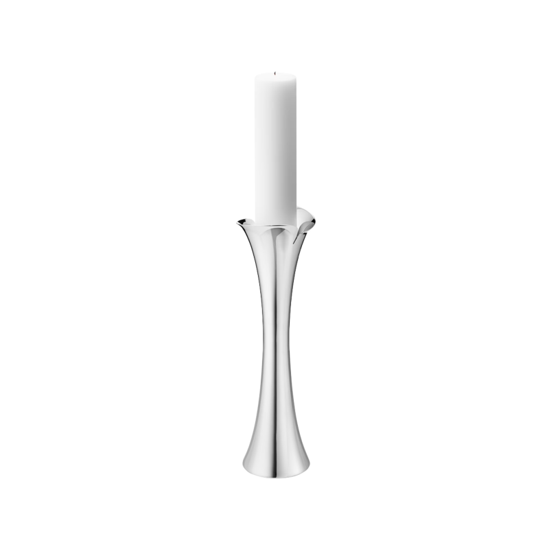 This floor candle holder features soft, organic shapes inspired by a blooming flower. Helle Damkjær designed the candle holder as part of the popular Bloom collection, and it is crafted from hand-polished stainless steel.