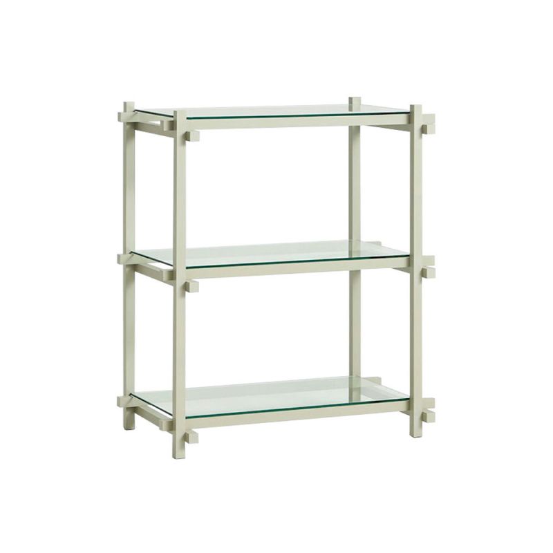 • Frame: Smokey Grey Beech Shelves: Powder Coated Steel, Clear Glass
