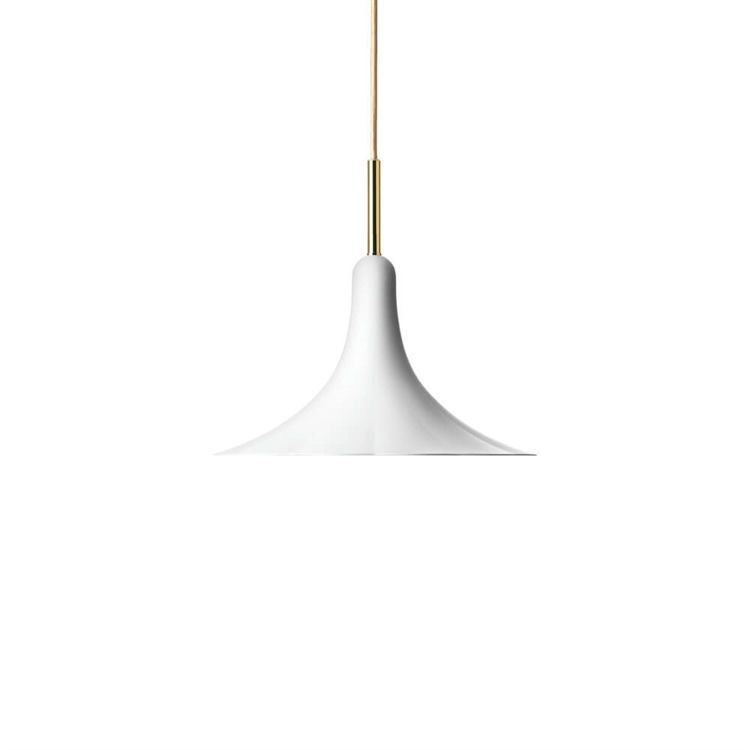 The flower-shaped shade of white metal and brass frame creates a romantic look in the home.