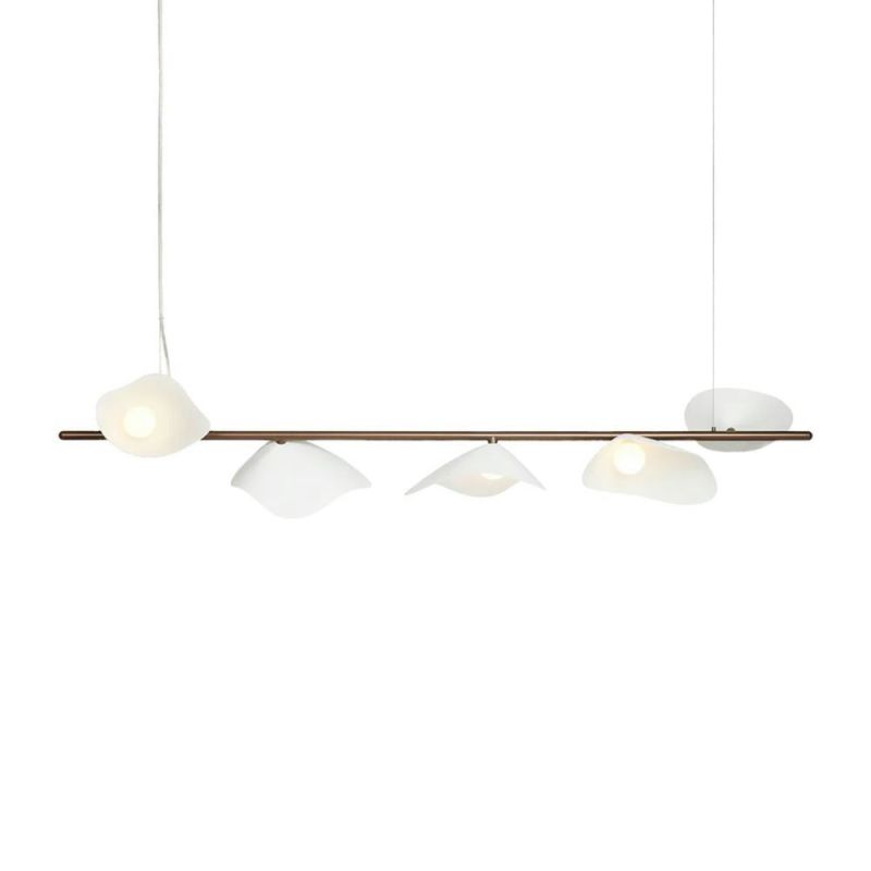 Florii 5 Linear. Florii 5 Linear is a modern interpretation of the chandelier ideal above the dining table or kitchen island. The soft white metal shades are balanced by a slim, linear metal rod, creating a harmonious, organic look. Integrated LED ensures long-lasting, warm light and can easily be replaced without tools.