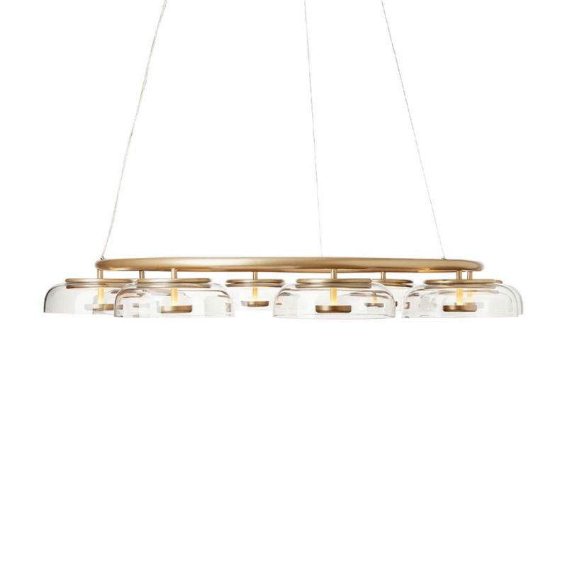 Blossi 8 is an elegant chandelier inspired by the golden rays of the sun reflected in autumn leaves. With a diameter of 103 cm and a height of only 11 cm, it creates a striking yet light expression in the room. A flexible wire system allows the suspension to be adjusted to fit both low and high ceilings. The chandelier is part of the Blossi collection, now updated with low voltage technology and a replaceable LED board that delivers flicker-free light and meets the latest EU requirements. The light is sent upwards from a golden metal disc and softly reflected in the mouth-blown glass shades, creating warm and atmospheric lighting. The new version is also compatible with most dimming systems.