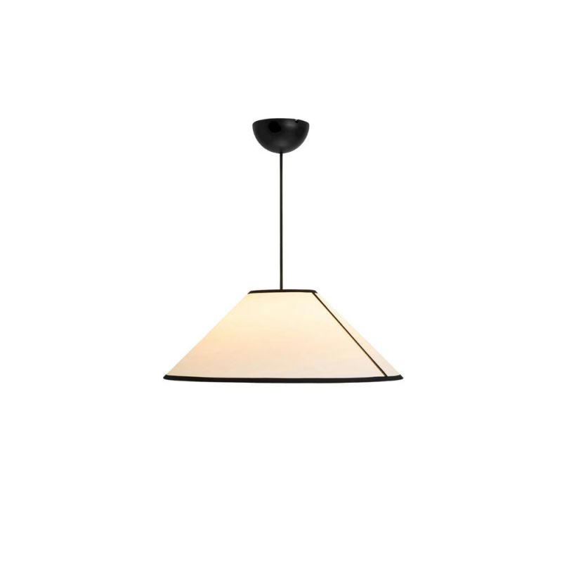 Ava Cone Pendant Lamp designed by Ana Kra for HAY. A modern interpretation of the classic empire pendant with a conical, semi-transparent shade in ECOPET (recycled PET plastic) and contrasting fabric edge. The lamp provides soft, atmospheric light and fits perfectly in bedrooms, hallways, living rooms, and dining rooms. Delivered with HAY Common Cord Set and uses a replaceable, dimmable LED bulb.