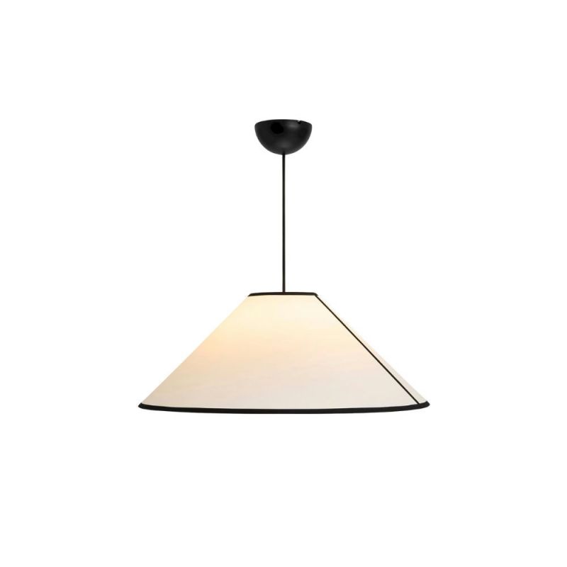 Ava Cone Pendant Lamp designed by Ana Kra for HAY. Modern interpretation of the classic empire pendant with conical, semi-transparent shade in ECOPET (recycled PET plastic) and contrasting fabric edge. The lamp provides soft, ambient light and is perfect for bedrooms, hallways, living rooms, and dining rooms. Comes with HAY Common Cord Set and uses a replaceable, dimmable LED bulb.
