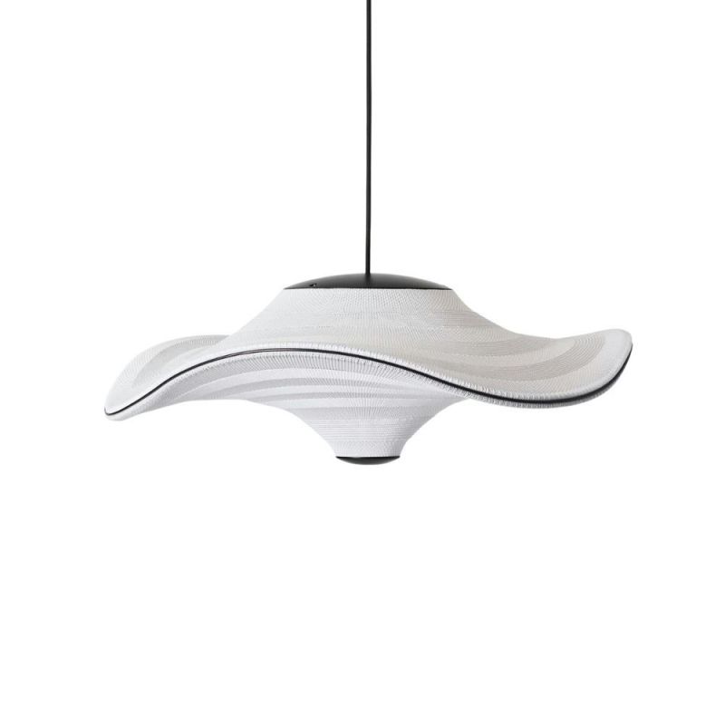 Flying is a family of sculptural pendant lamps with a soft organic shape. When suspended, they appear to float beautifully in the air. The distinctive shape of the Flying lamps is created by stretching the 3D knit material between the aluminium wavy frame and centerpiece that keeps the top and bottom apart. The LED light source is built into the top of the lamp so the light is softly diffused through the knitted bottom part of the lamp.