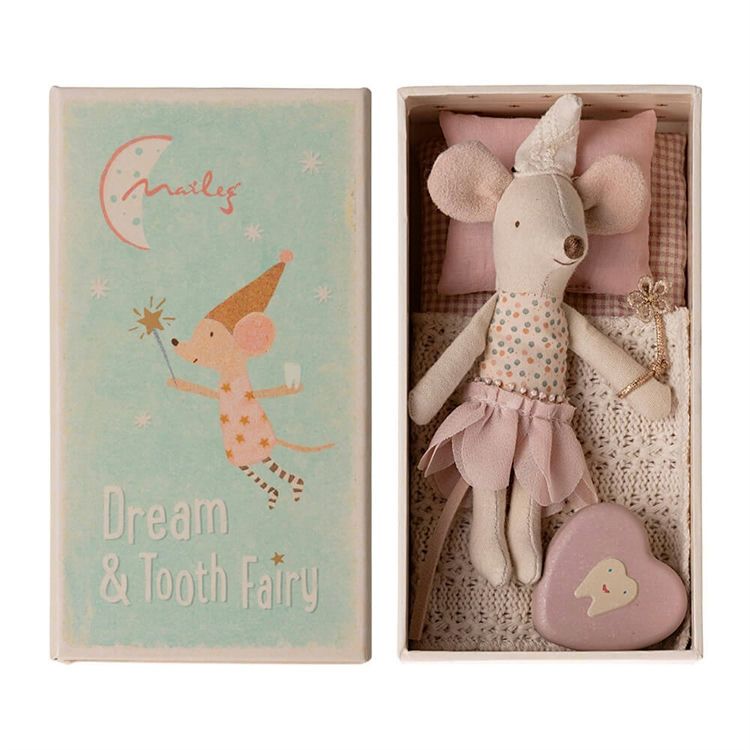 Meet the Maileg tooth fairy who brings adventures and dreams! She collects baby teeth and ensures sweet dreams, dressed in her magical clothes and sleeping safely in soft bedding. The set also includes a tooth box and matchbox perfect for a good night's sleep.