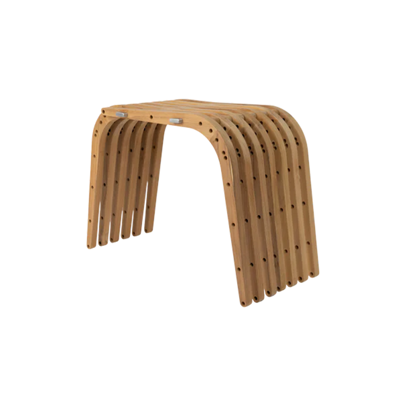 Multifunctional chair, stool and table made from 13 boomerangs in FSC teak wood for both indoor and outdoor use.