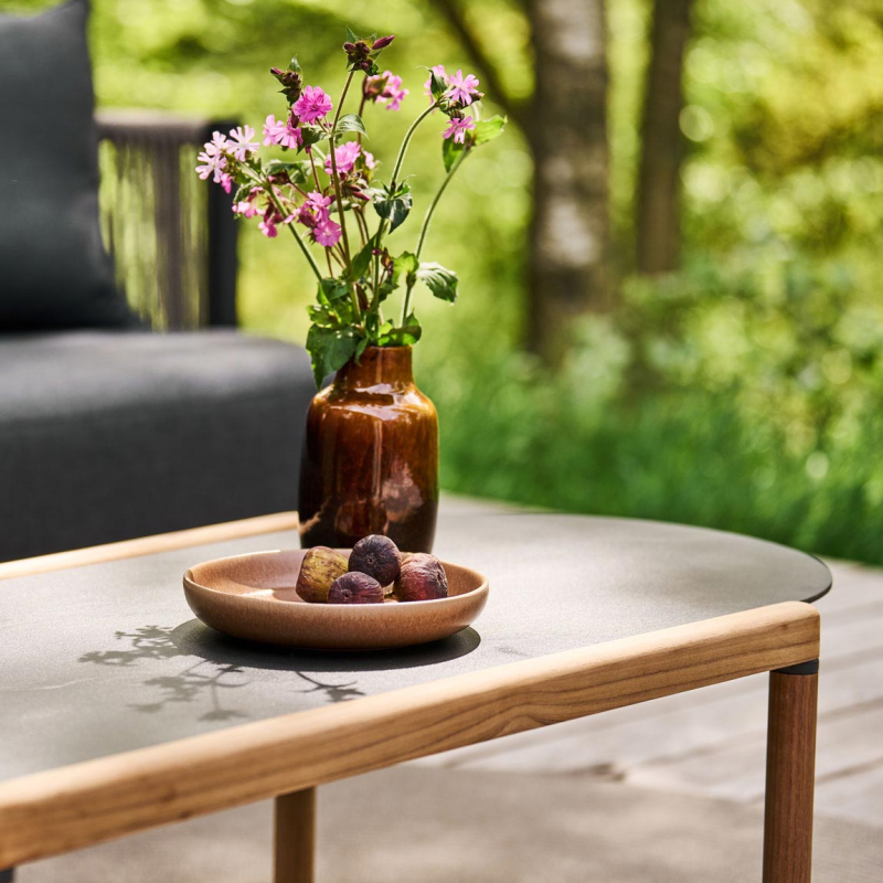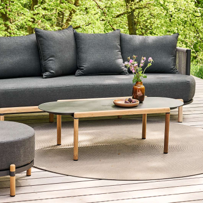 With an inviting oval shape and a refined blend of teak and aluminium, the Mindo 107 Coffee Table features a high-quality ceramic tabletop that provides a durable and elegant surface for outdoor living.
