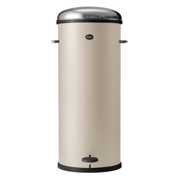 The Vipp17 pedal bin is a 30-liter waste bin, the largest in the Vipp range. It has a damping mechanism for silent lid closure and a rubber ring that ensures a tight seal. The body of the bin is made of powder-coated steel or stainless steel and contains a removable galvanized steel inner bin. A rubber ring at the bottom protects sensitive surfaces.