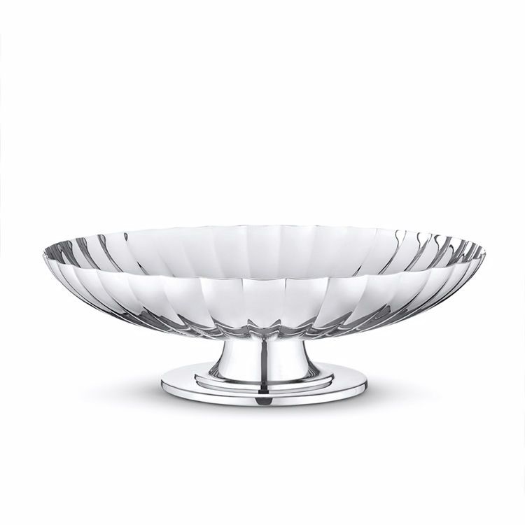 The Bernadotte platter on foot was designed by Prince Sigvard Bernadotte, the man behind many of the great Georg Jensen icons. Inspired by Sigvard Bernadotte, Georg Jensen has created this elegant dish that completes the range of tableware in the Bernadotte collection. The curved surface is inspired by bowls from the Bernadotte collection and rests beautifully on a base taken from the original candlesticks. The Bernadotte dish on a base can adorn the dining table with fruit or other exciting items.