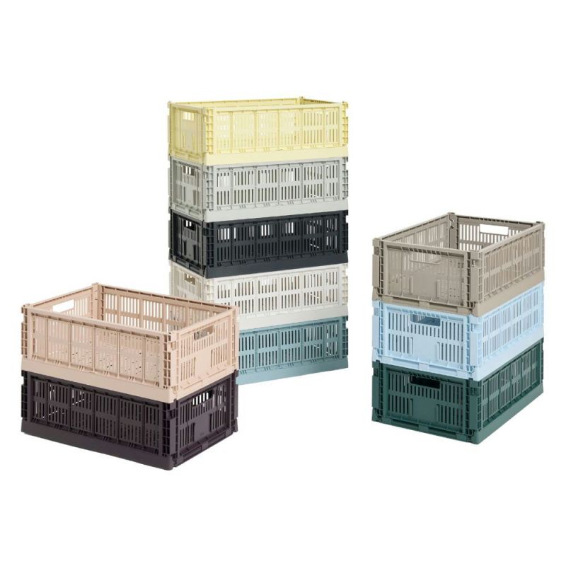 HAY Colour Crate is a series of colorful storage boxes with a perforated design. Made from 100% recycled plastic, they are available in different colors and sizes. The boxes can be stacked and used for storage on shelves, tables or in cabinets. Lids and wheels are also available for sizes Medium and Large. Medium and Large.