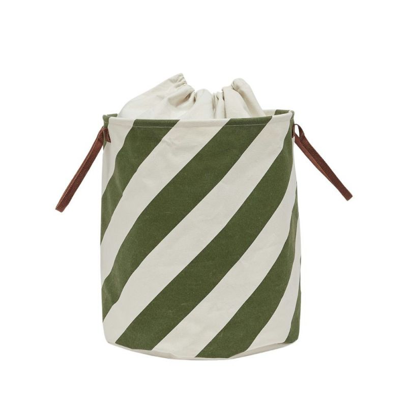 The Sakki basket combines functionality with playful design. It features a striped pattern and a drawstring closure, making it easy to organise and carry duvets, toys or other items. A practical and decorative solution that fits into any home.