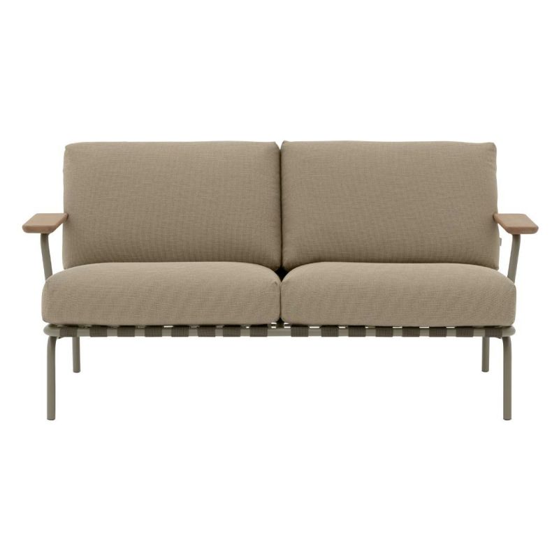 The Settle Outdoor Sofa combines comfort and style for outdoor use. The airy steel frame with fine details and FSC-certified (FSC-C028824) sapele-mahogany armrests provide a warm and inviting feel. The frame is galvanized, primed and powder coated for durability, while the quick-drying cushions in durable fabric ensure year-round comfort.