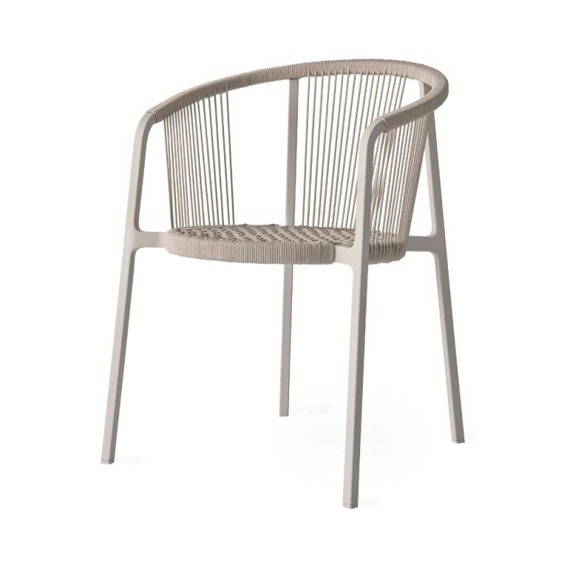 The stackable Lagrasse chair has a simple, powder-coated aluminum frame with a round backrest that doubles as an armrest. A comfortable cushion in woven outdoor fabric completes the design. Perfect for small outdoor spaces or flexible use in the garden, the Lagrasse series creates cozy seating no matter the size of the space.