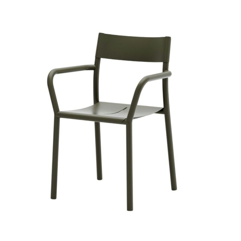 May series. Outdoor furniture in powder-coated steel created for garden, terrace and balcony. The series consists of stackable chairs with and without armrests and tables in two sizes, all designed to complement each other. The monochrome look is simple and elegant, while the curved steel plate and robust frame ensure both strength and comfort. A discreet slot in the seat provides drainage and lightness, a design feature that runs throughout the series and ties the look together.