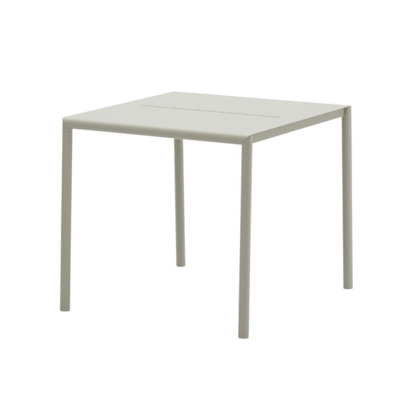 May series. Outdoor furniture in powder-coated steel created for garden, terrace and balcony. The series consists of stackable chairs with and without armrests and tables in two sizes, all designed to complement each other. The monochrome look is simple and elegant, while the curved steel plate and robust frame ensure both strength and comfort. A discreet slot in the seat provides drainage and lightness, a design feature that runs throughout the series and ties the look together.
