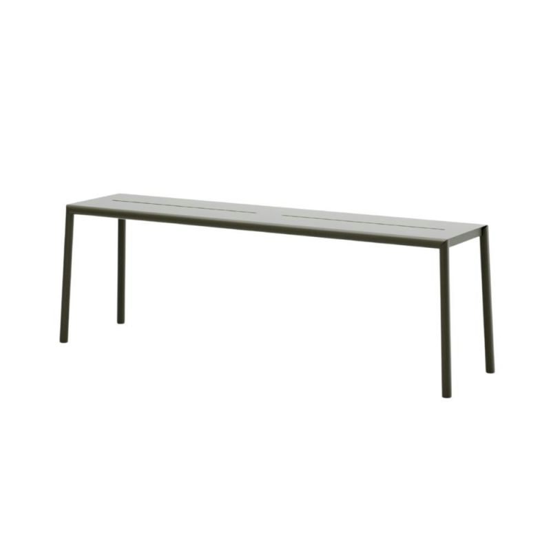 May series. Outdoor furniture in powder-coated steel created for garden, terrace and balcony. The series consists of stackable chairs with and without armrests and tables in two sizes, all designed to complement each other. The monochrome look is simple and elegant, while the curved steel plate and robust frame ensure both strength and comfort. A discreet slot in the seat provides drainage and lightness, a design feature that runs throughout the series and ties the look together.