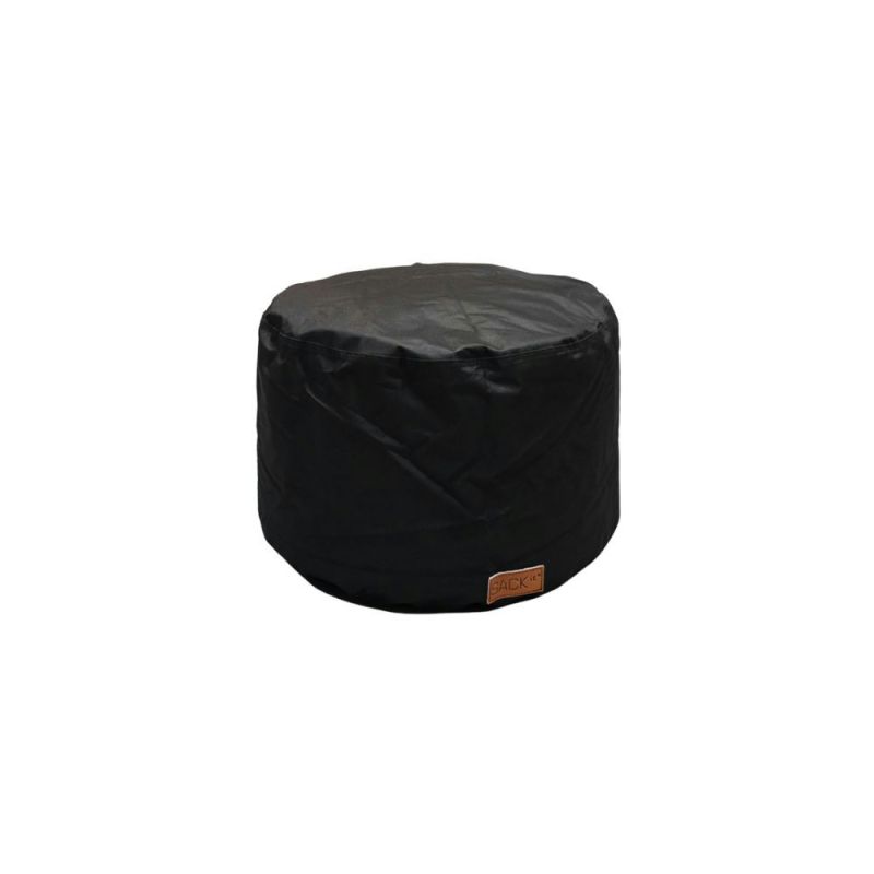 The cover is made of black water-repellent material and is custom-made for the pouf.