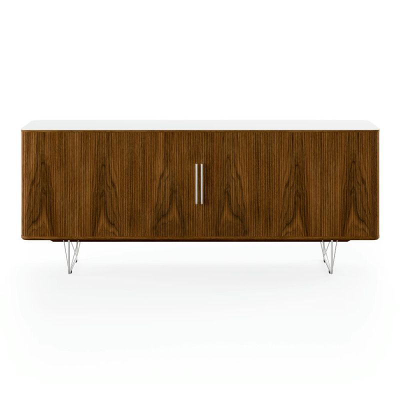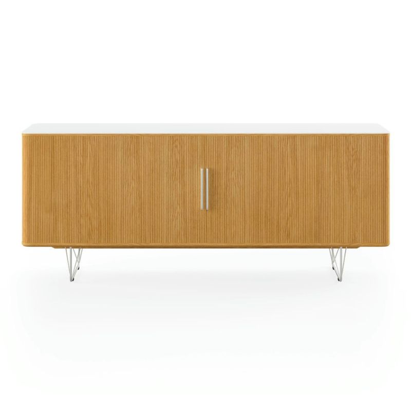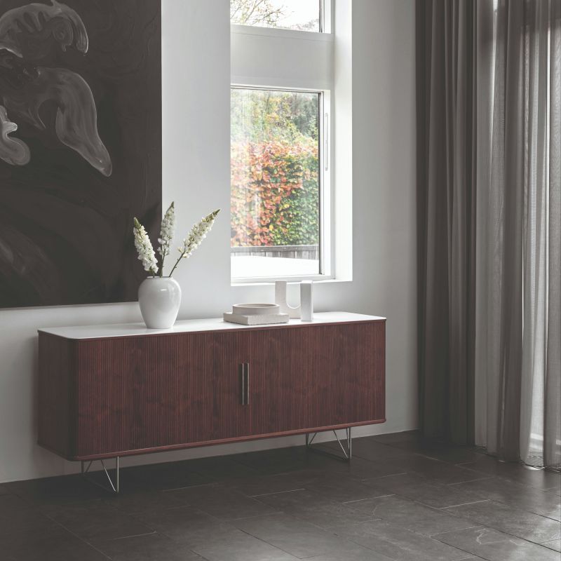 AK 2730-2732 is a classic sideboard that has received a modern twist with a Corian top and handles, as well as a stainless steel frame or point base.