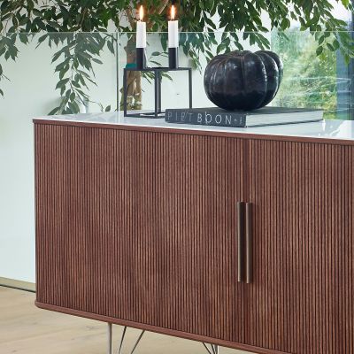 AK 2730-2732 is a classic sideboard that has received a modern twist with a Corian top and handles, as well as a stainless steel frame or point base