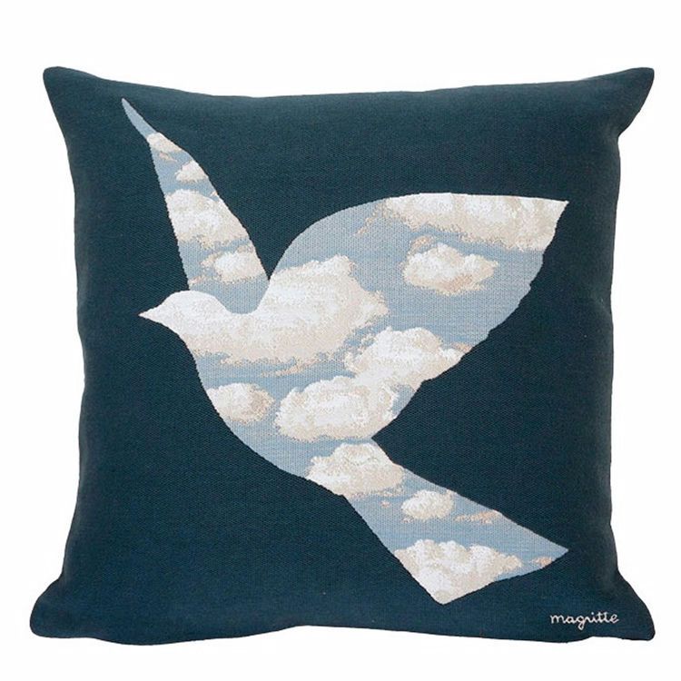 Artist Rene Magritte is known for his unusual yet beautiful paintings. He painted ordinary things in his pictures, yet he made them so enigmatic that it gave admirers of his artwork something to think about. Rene Magritte painted this painting L´oiseau de ciel in 1965. The original painting depicts a dove with a body full of clouds flying over a lighted runway. Poulin Design and French weaver Jules Pansu produce these beautiful cushions with some of Magritte's artwork on them. The cushion cover of the Poulin Design cushions is 100% down-proof cotton and made without chemicals.