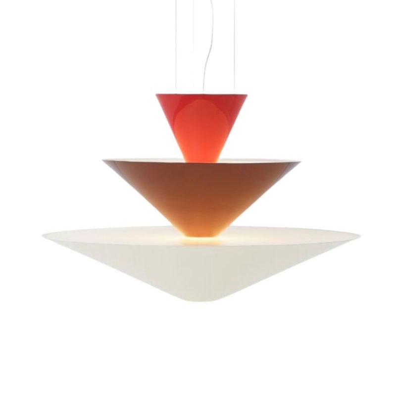 Inspired by Gio Ponti's Murano chandelier, the Gio chandelier conveys the same eye-catching expression while focusing on basic geometric shapes and vibrant color combinations. With a minimalist design and an impressive appearance, the chandelier celebrates the union of classic and modern forms in a cohesive whole.