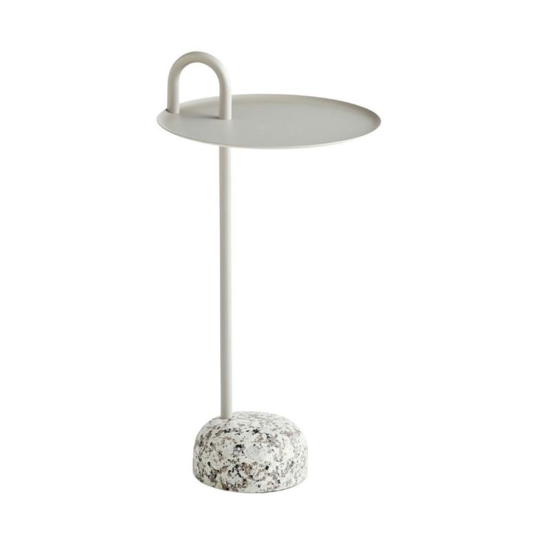 The Bowler Table by Shane Schneck is a compact side table, perfect for small spaces. It has a distinctive tube that doubles as a handle. The table is made of powder-coated steel with a heavy granite base that provides stability but is still easy to move. It comes flat-packed and is easy to assemble, ideal for both home and office.