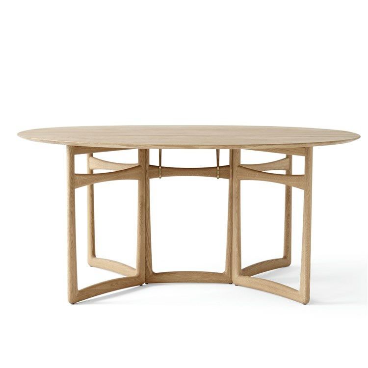 The HM6 Dining Table is designed by Hvidt & Mølgaard and is made of solid oak or walnut with beautiful brass details. The table can be folded out on either side to create a table that is either semicircular, oblong or round. The Drop Leaf series is also available as a folding coffee table, HM5, which can be found here.